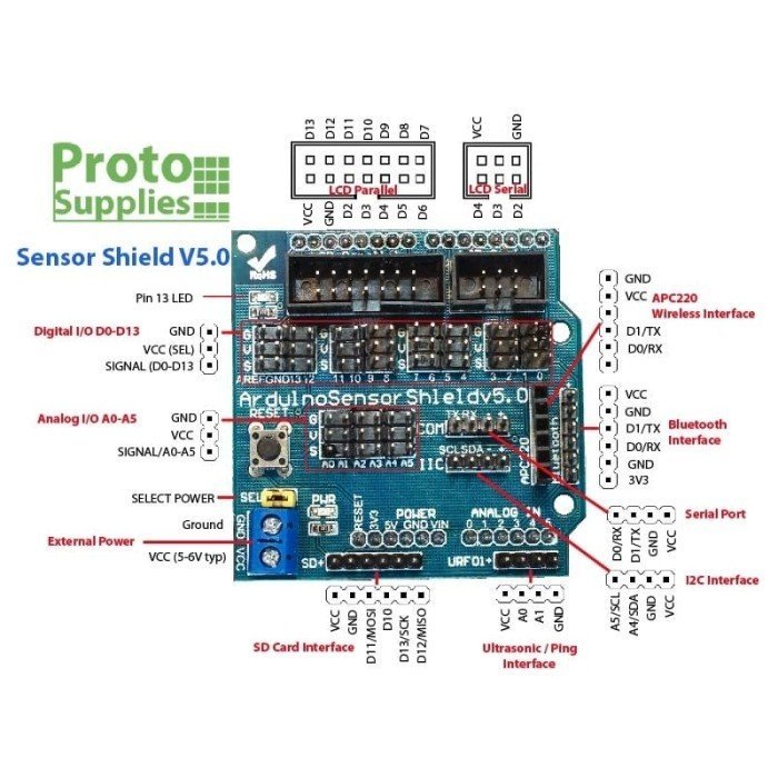 Sensor Shield v5.0 ini memungkinan anda menghubungkan berbagai modul seperti sensor, servo, relay, tombol, potensiometer. Setiap pin input/output digital maupun analog telah dilengkapi dengan VCC, GND, dan Output.