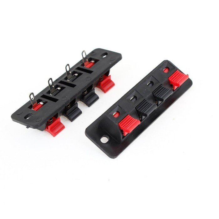 Terminal ini dilengkapi dengan 4 pin, yang memungkinkan Anda untuk menghubungkan dua kabel speaker sekaligus. Penggunaan terminal ini mempermudah penyambungan kabel speaker tanpa perlu menggunakan solder, karena Anda cukup memasukkan ujung kabel speaker ke dalam terminal, kemudian menjepitnya dengan cara yang sederhana namun kuat.