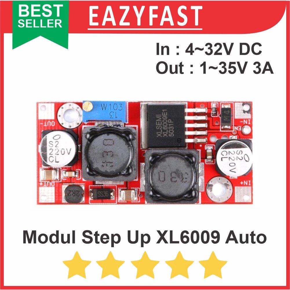 Auto Buck Boost XL6009 ini adalah alat penaik dan penurun tegangan dwi fungsi lengkap dengan stabilizer output. **Kelebihan: 1. Dua fungsi dalam 1 alat (Auto Buck + Boost) 2. Bisa menaikkan tegangan input (Boost) 3. Bisa menurunkan tegangan input (Buck) 4. Output tetap stabil walaupun input naik turun (Stabilizer: Tested) **Sangat cocok utk: 1. Penstabil tegangan aki naik turun mobil/motor 2. Solar panel / solar energy 3. Listrik kincir angin 4. Praktikum dan proyek elektronika yang memerlukan listrik yg stabil **Contoh pemakaian: 1. Ketika mobil/motor distarter, tegangan aki akan turun ke 7-8v, dan ketika mobil/motor melaju kencang, tegangan aki bisa naik hingga 15v atau lebih. Alat ini dapat menstabilkan tegangan tetap pada 12v atau tegangan lainnya sesuai settingan kita (Auto Buck Boost) 2. Solar Panel, tegangan batere bisa naik turun tergantung kondisi cahaya matahari, siang dan malam (tidak stabil). Peralatan listrik dapat rusak karenanya. Alat ini dapat menaikkan / menurunkan tegangan stabil pada tegangan output yang sudah kita tentukan (auto buck boost) sehingga sangat cocok untuk pemakaian solar panel. 3. Praktikum/proyek elektronika, tidak repot lagi menggunakan 2 modul step down dan step up. Praktis dengan 1 alat bisa melakukan 2 fungsi tersebut. **Spesifikasi: Tegangan input: 3.8-32v DC Tegangan output: 1.25-35v DC (stabil walau input naik turun) Arus input: max 3A (recommended 2.5A) Efisiensi: max 94% Chip: XL6009 Switching frequency: ultra high 400 kHz Low output ripple: 50 mV Ukuran: 25x14x48mm Lobang baut: 2 **Catatan: 1. Utk pemakaian jangka panjang: direkomendasikan arus max 2.5A 2. Jika beban output melebihi 10w: direkomendasikan memakai tambahan heatsink 3. Utk menjaga kestabilan output: pastikan selisih input dan output minimal 1.5v