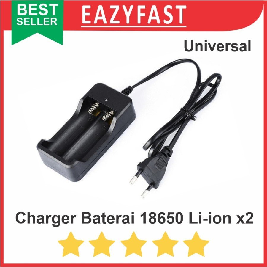 Charger 2 Port universal untuk berbagai batere rechargeable Li-Ion antara lain: – 18650 – 14500 – 26650 – dan sebagainya Tersedia 2 port untuk pengecasan 2 baterai sekaligus, lebih cepat dan praktis, tidak perlu menunggu satu per satu. Memiliki bagian negatif (-) berupa per yang dapat menyesuaikan dengan panjang berbagai jenis baterai tsb. **Spesifikasi: – Jumlah port: 2 – Input: AC100-240V 47-63Hz – Output: 3.7V/500mA – End Of Charge Voltage: 4.2v +/- 1%