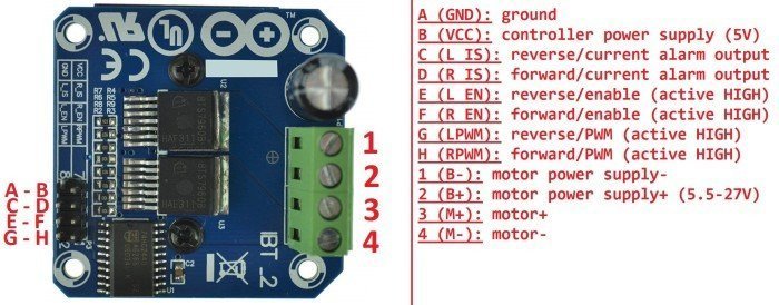 BTS7960 High Current Motor Driver H-Bridge Module for Arduino BTS-7960 adalah motor driver (seperti L298D) namun di design untuk arus yang lebih tinggi (Max. 43A). Menggunakan Chip BTS7960 dari Infineon, sudah dilengkapi dengan thermal over current protection untuk perlindungan dari over current dan driver isolation yang membuat microcontroller dan motor terisolasi, sehingga surge current dan noise tidak merambat ke microcontroller
