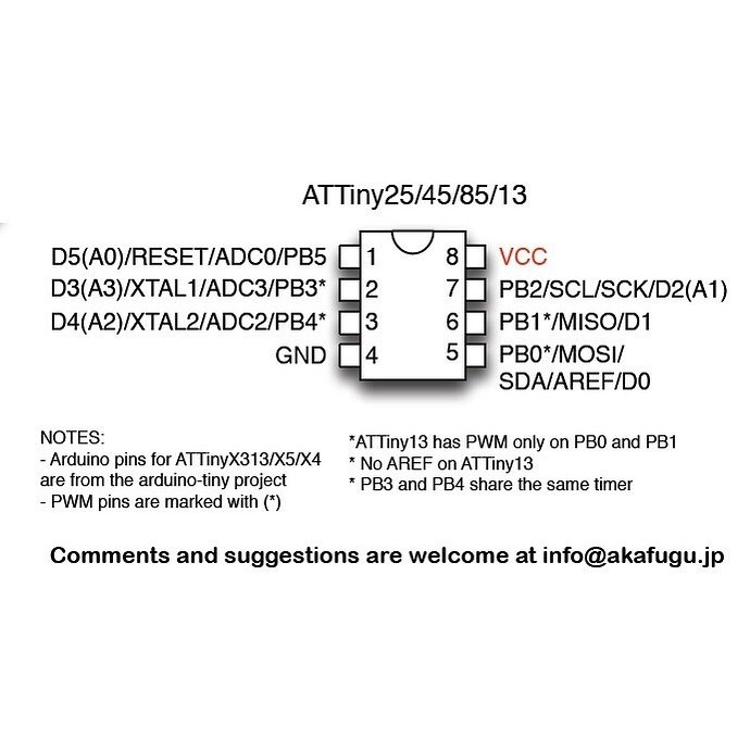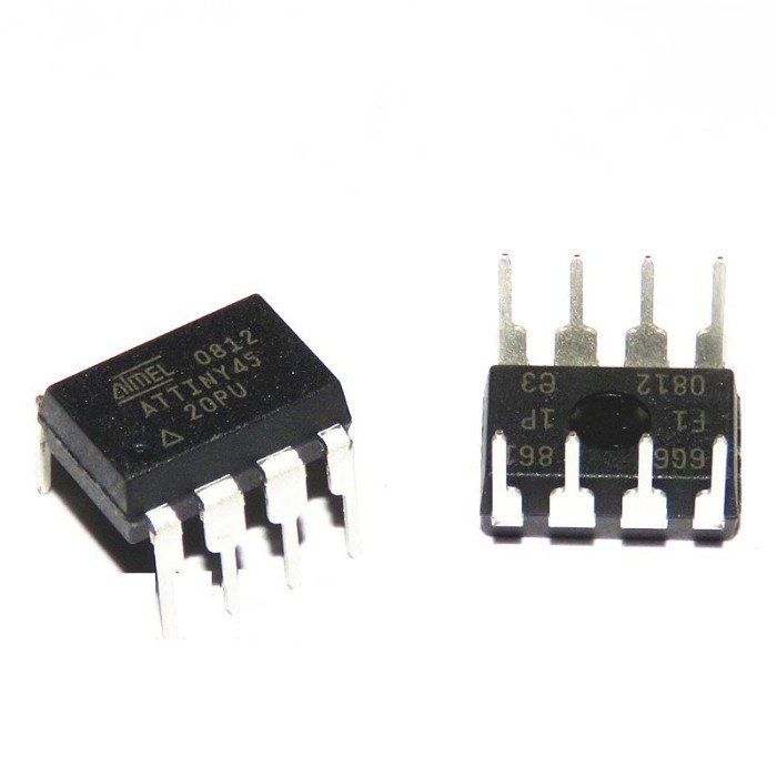 ATTiny45 memiliki arsitektur AVR yang canggih dan dilengkapi dengan 8 pin input/output digital yang dapat dikonfigurasi sebagai input, output, atau fungsi khusus. Meskipun memiliki jumlah pin yang terbatas, IC ini tetap menyediakan kemampuan yang lengkap untuk mengendalikan perangkat elektronik.