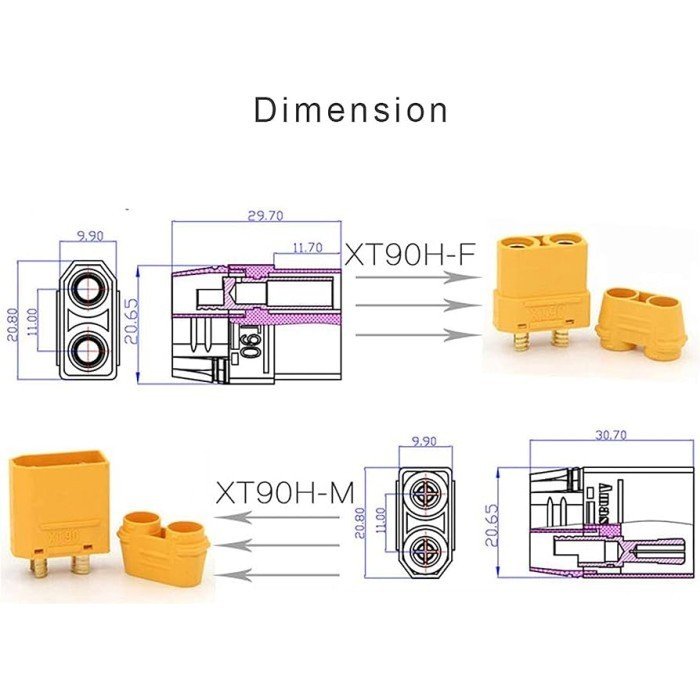 Konektor XT90 terbuat dari bahan nylon kualitas tinggi sehingga mampu bertahan dengan temperatur yang tinggi, sedangkan untuk spring connector terbuat dari gold plated yang tahan terhadap korosi dan mampu mengalirkan arus besar dengan stabil.