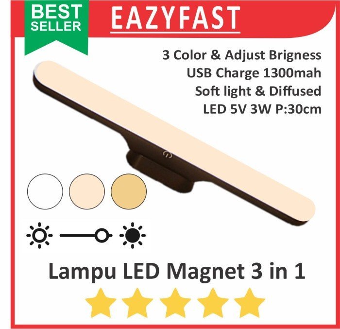 Lampu Tempel LED Black Magnet 3in1 USB Charge 5V 3W 3 Warna Color Putih White Warm Dinding Cermin Make Up Meja Baca Belajar Rak Lemari Touch Adjustable Brightness