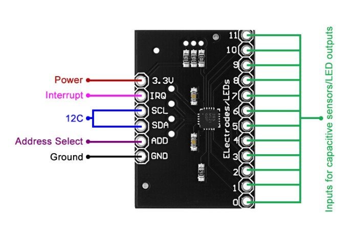 interface The chip can control up to twelve individual electrodes, as well as a simulated thirteenth electrode The MPR121 also features eight LED driving… pins. When these pins are not configured as electrodes, they may be used to drive LEDs.