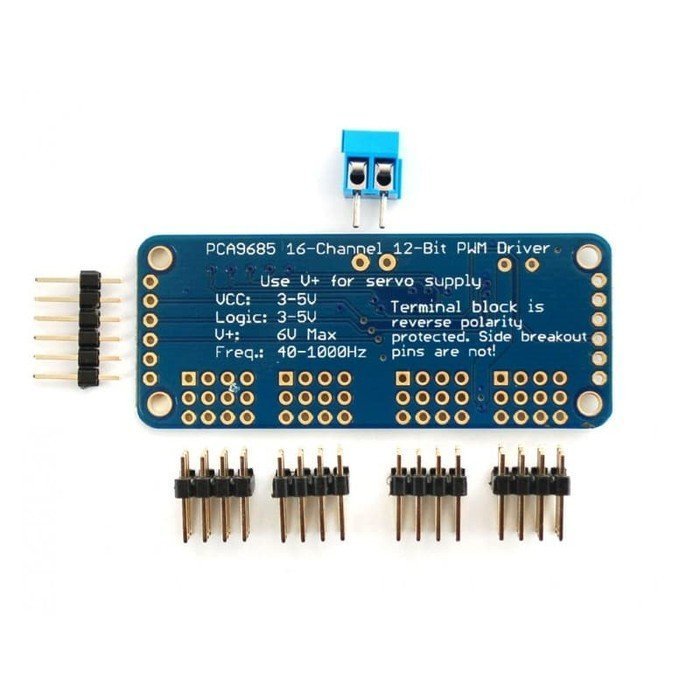 – 3 pin connectors in groups of 4 so you can plug in 16 servos at once (Servo plugs are slightly wider than 0.1″ so you can only stack 4 next to each other on 0.1″ header