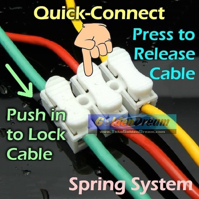 Model 3 kabel Super wire connector yang mudah dipakai, dengan system Quick-Connect Spring, menyambungkan kabel semudah menekan tombol keyboard, tanpa perlu baut dan alat bantu, cukup jari tangan Anda. Mempersingkat waktu pemasangan, menghemat biaya baut, listrik dan gaji pekerja. Kelebihan: 1. Tidak perlu baut, obeng, tang press 2. Ukuran kecil dan ringan 3. Bisa dipakai berulang kali 4. Bisa utk koneksi hingga 100 watt 5. Bahan per/spring logam berkualitas, keras dan flexible 6. Material anti api memenuhi standar sertifikasi keamanan 7. Universal, bisa dipakai utk semua kabel ukuran 0.5 mm2 hingga 3.5 mm2 (tunggal maupun serabut)